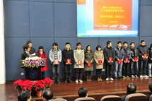 捐赠仪式之后,各捐助单位、与会嘉宾和理事代表为2009~2010学年本基金的各位奖学金获得者、建筑工程学院“十佳教工”奖教金获得者、教学成就奖获得者、教学新秀奖获得者颁发获奖证书。最后,教学成就奖获得者毛根海教授、获奖学生代表高翔同学讲话。