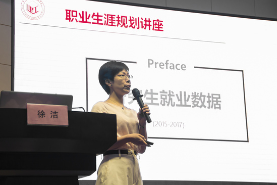 最后学院学工办主任徐洁老师为同学们讲解了职业规划方面的知识。徐洁老师首先指出建工学院毕业生就业单位较多集中于设计院、房地产、科研院校等,她号召大家拓宽就业方向,可以多多考虑往国企、选调生等,培养业务知识和综合素养。另外,徐老师还强调自我了解对于就业的重要性,经历与悟性二者不可或缺,并告知大家各类职业探索的途径,包括宣讲会、实习经历、学姐学长口述等。