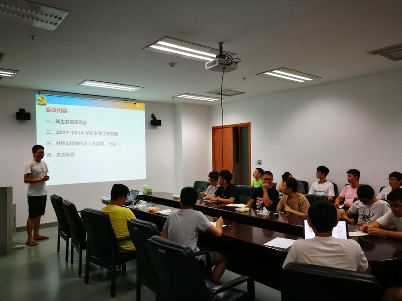 党支部书记周燕国老师、支部副书记文凯同学组织本次会议,共27名党员与会,其中新生党员13名。本次支部大会共分为四个部分,包括:新生党员见面会、2017-2018学年支部工作总结、井冈山精神传达和支部换届选举。会议开始,每位同学都热情地做了自我介绍,和大家分享了自己的家乡、导师以及兴趣爱好等。
