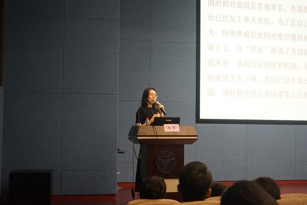 接下来,作为形式与政策课Ⅱ的第一课,学院党委副书记张威老师就中美贸易战这一时事,为同学们开了一堂别开生面、引人深思的报告会。张威老师从经济、政治、文化等多方面阐述了中美贸易战带来的多边影响,深刻分析了中美贸易战中美国和中国各自扮演的角色和定位,并结合实际出发,分析了我国的一系列应对之策,让同学们深刻体会到了大国的力量和担当。