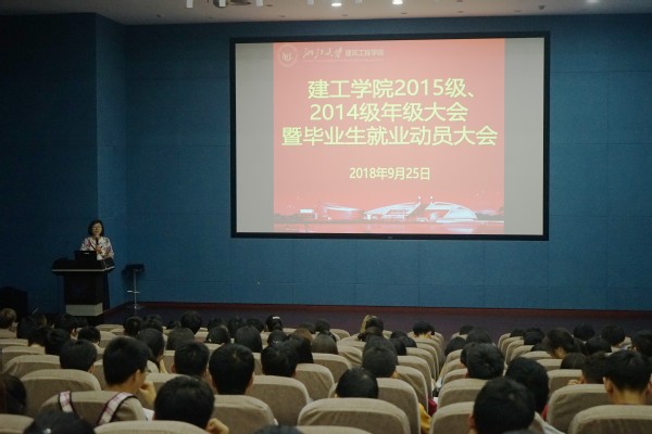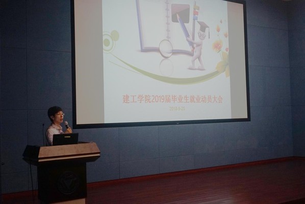 2018年9月25日19点30分,2019届本科毕业生就业动员大会暨形式与政策课Ⅱ在安中报告厅举行,建筑工程学院党委副书记张威老师、学工办主任徐洁老师、辅导员郭鹏越老师和吾希洪老师以及全体2019届本科毕业生参加了本次大会。