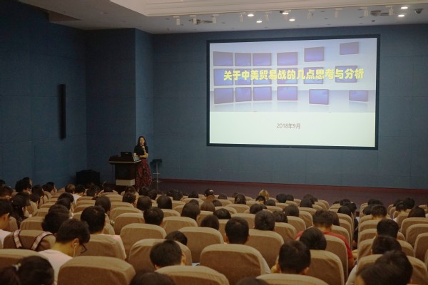 随后,党委副书记张威老师就关于中美贸易的思考为同学们上了一堂别开生面、引人深思的形式与政策课。张威老师从经济、政治、文化等多方面阐述了中美贸易战带来的多边影响,深刻分析了中美贸易战中美国和中国各自扮演的角色和定位,并结合实际出发,分析了我国的一系列应对之策,让同学们深刻体会到了大国的力量和担当。