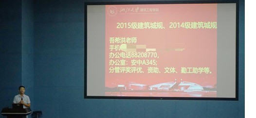 最后,郭鹏越老师作了大会总结说明,就二课、社会实践和形势与政策等相关事项进行了详细的解答并正式向同学们介绍了2015和2014级建筑城规的辅导员吾希洪老师。