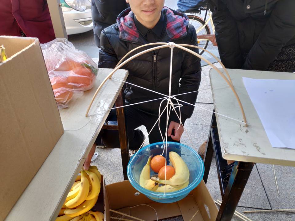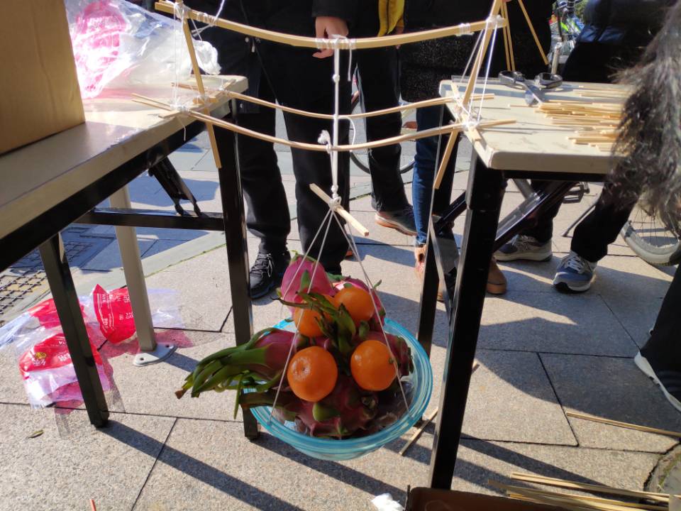 活动开始后,便陆陆续续的有同学前来观看。活动当天,天色正好,气温虽一直比较冷冽,但依旧难挡同学们旺盛的好奇心和不断迸发的创作灵感。现场的气氛紧张而又热烈,多支队伍在一顶遮阳棚和四条长桌子组成的比赛场地上天马行空、大发其想。或独自一人,或通力合作,在值班人员的监督提醒下争分夺秒地构造属于自己的水果桥。而结果也很喜人,各种形式多样的“桥”层出不穷,有美观大气的竹制拱桥、竹条与线完美结合的双拱桥、稳固的满是三角形结构的直桥,令人眼花缭乱的同时又不禁惊叹万分,耳目一新。
