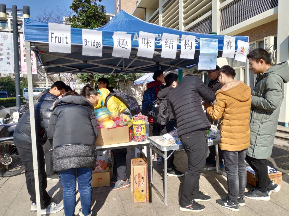 为丰富同学们的课余生活,将同学们的理论知识与实践相结合,激发创新创造能力,ASCE@ZJU经过前期紧张的准备工作,在2018年12月29日11:00许在云峰学园紫云门口准时举办了一场趣味横生的水果桥结构大赛,活动吸引了众多学生陆续前来参观,期间,共有十多支队伍进行了这一结构挑战,场面一度十分热闹。