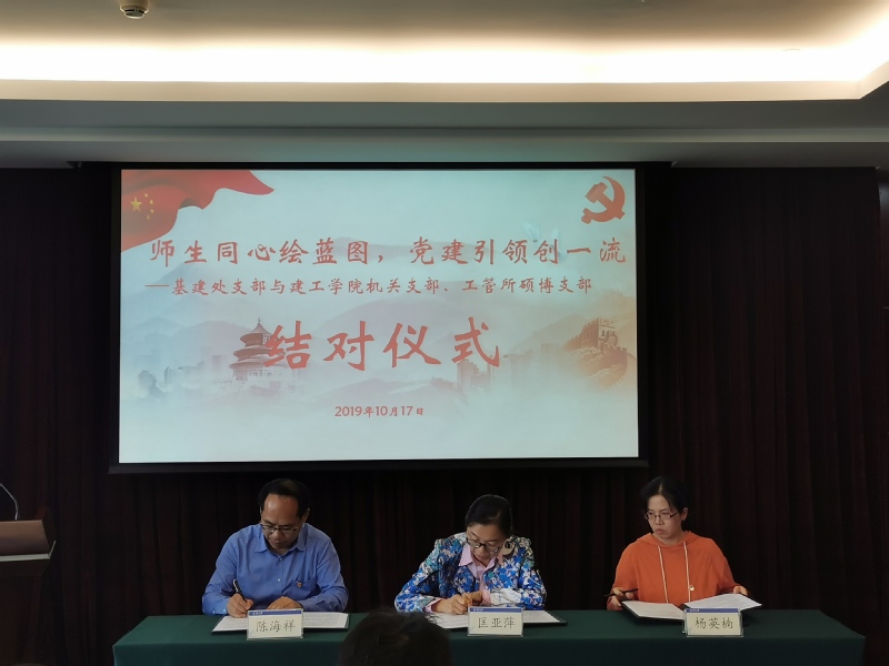 结对共建是学院与机关党支部建设的新途径,同时也是进一步探索基层党支部之间优势互补、资源共享、共同发展的党建新思路。基建处党支部与建工学院机关党支部、工管所硕博党支部的结对共建能够充分发挥基建处的工程技术优势和建工学院的学科优势,促进基建处与建工学院之间的联动,不断提高机关的服务和管理水平,推进新形势下基层党建工作的改革创新。本次结对仪式活动加上专题党课学习,不仅让三个支部收获了情谊,增进了彼此的感情,同时也收获了知识,促进了各个支部的发展,离实现“师生同心绘蓝图,党建引领创一流”的目标又近了一步。通过相互交流、相互学习、共同参与,三个支部不断加深了解和友谊,共同提高党建工作水平,有力促进各项业务开展,强强联合再出发,希望支部结对共建活动结出更加丰硕的成果。