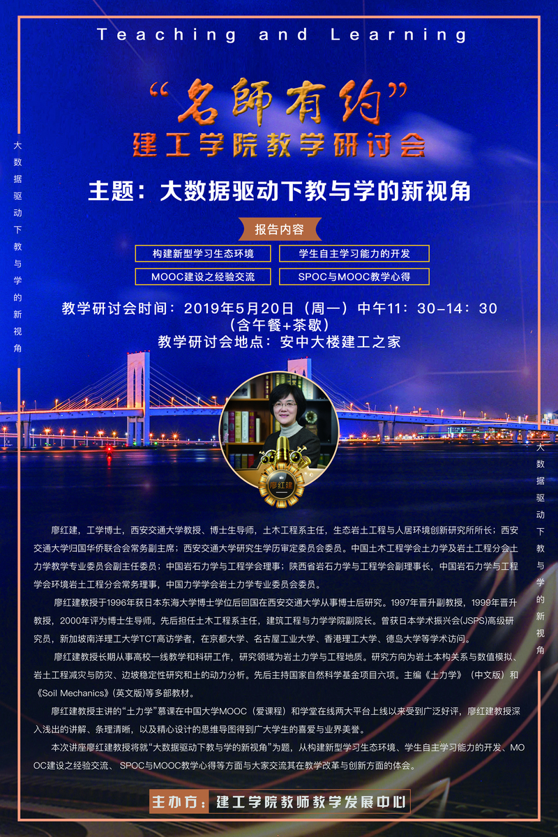 为了推动现代教育技术与教育教学的深度融合,促进优质教育资源应用与共享,全面提高教育教学质量,同时为老师们搭建起沟通、学习和交流的平台。 2019年5月20日中午,建工学院教师教学发展中心邀请了西安交通大学廖红建教授,在安中大楼建工之家举办了“名师有约”建工学院教学研讨会,主题为《大数据驱动下教与学的新视角》。