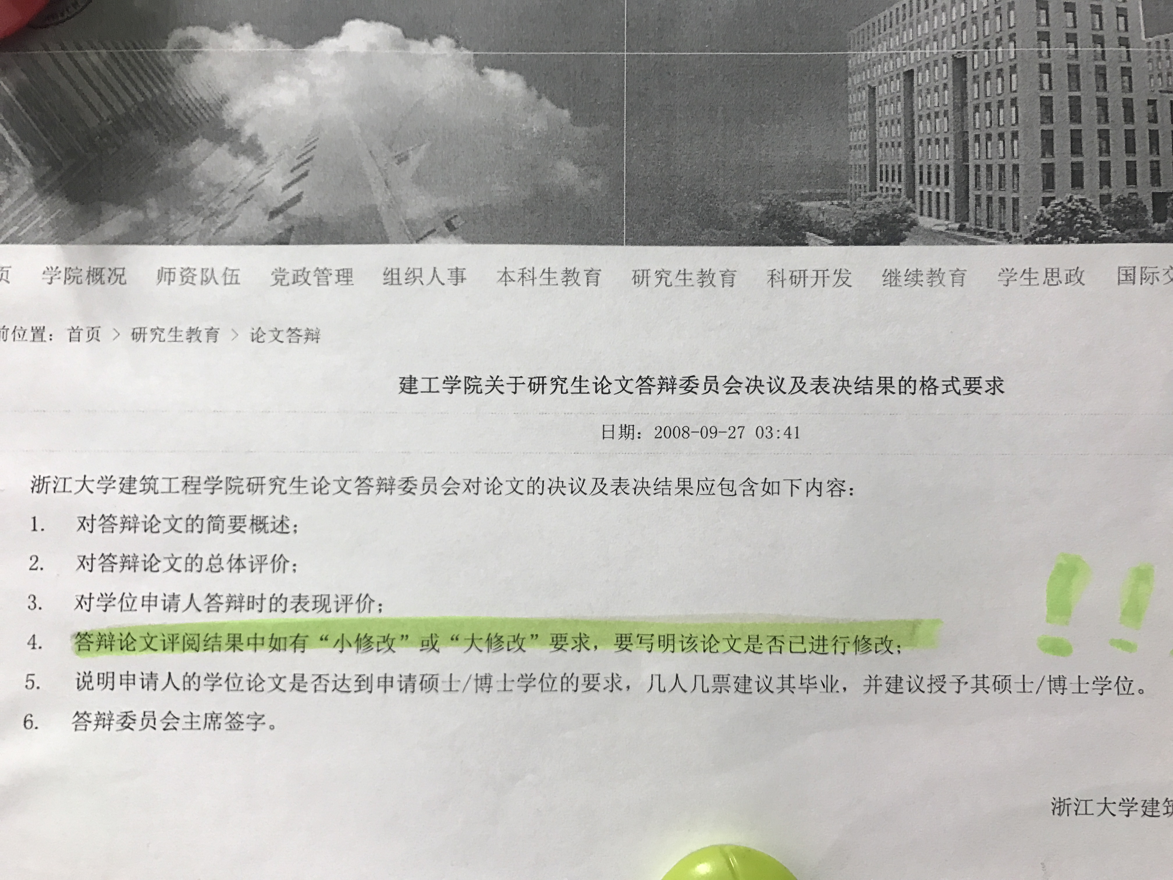 论文评阅意见有“大修改”或“小修改”的,如答辩委员认为已经逐条修改到位,请按照“建工学院关于研究生论文答辩委员会决议及表决结果的格式要求”中第四条做修改说明:《学位申请书》中“答辩决议”一栏需含有“论文已根据评阅意见进行相应修改”字样。