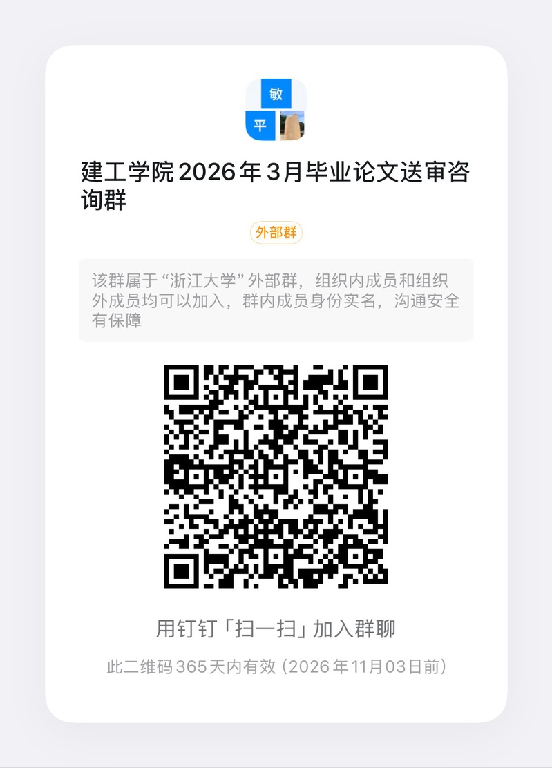 学位论文送审申请表-250915.docx对个人提交材料及系统审核状态进行确认,务必确保材料正确,申请表上列的项目都已审核通过。初次申请论文送审的同学请将《学位论文送审申请表》、核查要素清单、个人科研成果证明材料、《浙江大学建工学院硕博学位论文查重修改说明》、《浙江大学研究生学位论文预答辩申请表》、评审费报销单和论文评阅酬金表的纸质版材料按顺序理好,分别用订书机订牢,再用一个小夹子固定在一起,于1月7日当天下午5点前交至安中大楼A341沈老师处。学院将按照纸质材料进行审核,审核通过后3个工作日内将学位论文送专家评阅。