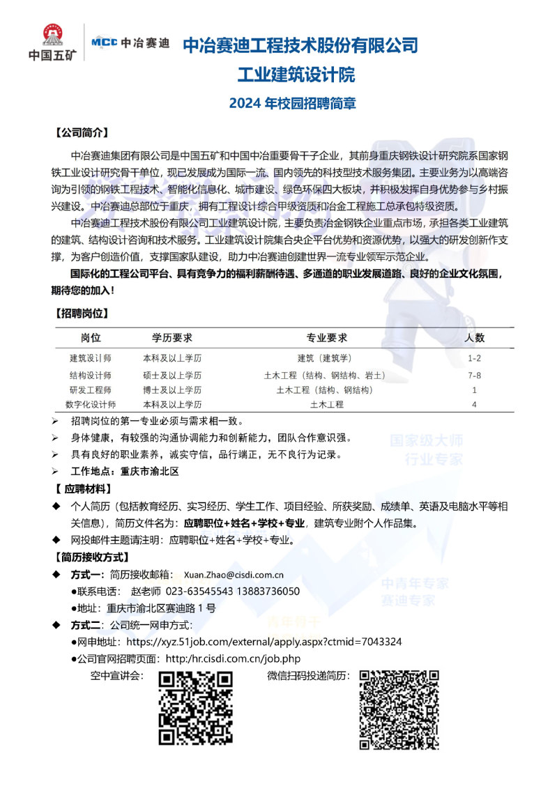 中治赛迪工程技术股份有限公司工业建筑设计院2024 年校园招聘简章