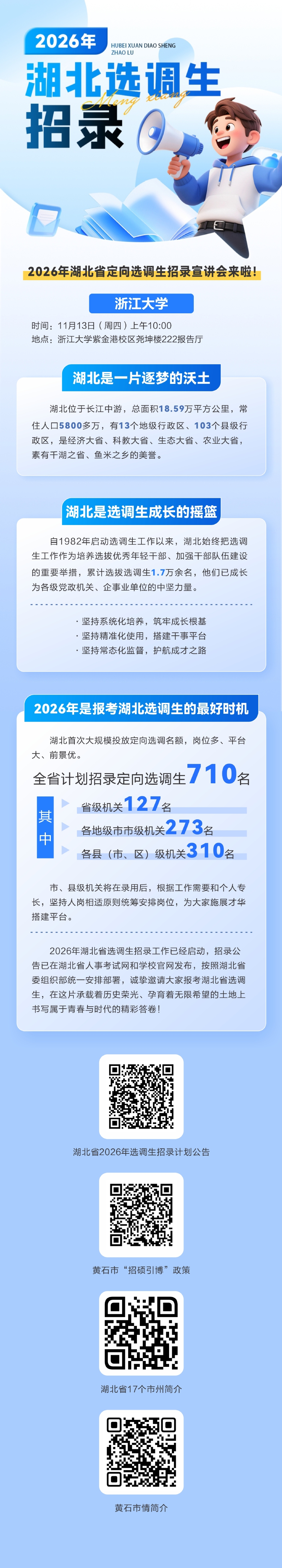 【选调生公告】2026年湖北省定向选调生招录公告(包含宣讲会信息)https://www.career.zju.edu.cn/notification/detail?xwid=435EB8E914C1FE3EE0653A68DD0E9B18