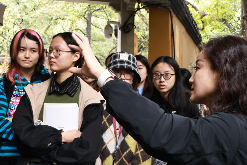 活动伊始,戚老师以飞来峰石刻、古建景观为“活教材”,围绕建筑形制、历史背景及专业术语展开讲解。同学们手持笔记本认真记录,遇到疑问及时提问,在与老师的互动交流中,深化对“符号结构学”理念的理解。