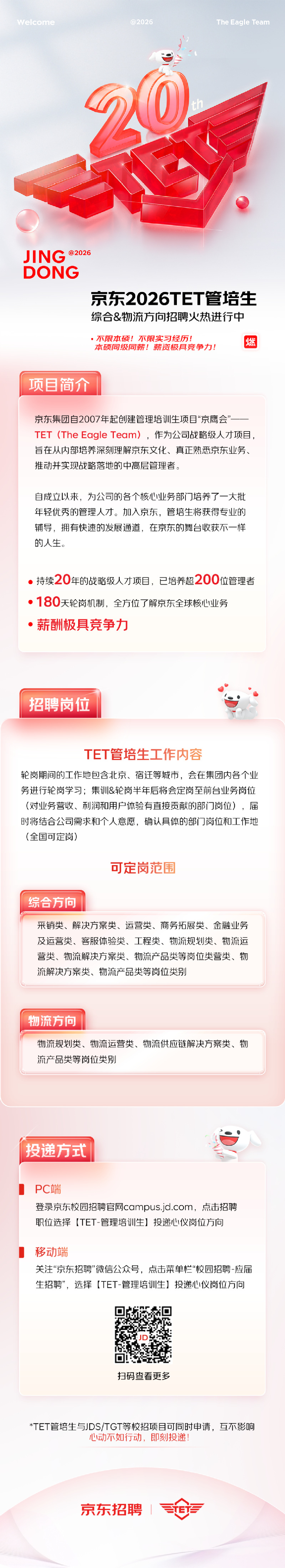 3、投递方式:PC端登录京东校招官网campus.jd.com,点击招聘职位选择【TET-管理培训生】投递综合方向或物流方向;移动端可扫描海报中的二维码进行投递。